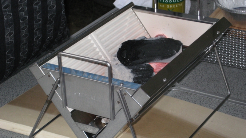 三角の部分は炭火を起こすのに便利なスターターで、折りたたみ収納できます。スターターの中に炭を並べ、下に着火剤を置くだけで簡単に炭全体に着火します。下の四角い部分がグリルで、4脚のスタンドに乗せて使います。