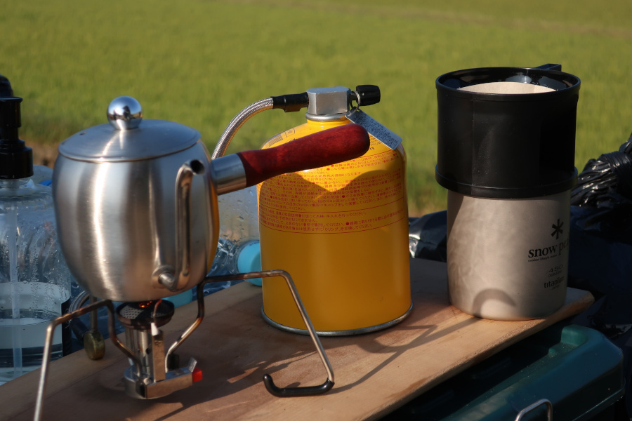 コーヒーポット:V-KING 500ml 直火可。バーナー:イワタニ・プリムス分離型シングル。カップ:snow peak チタンマグ450。ポットは二人用の容量ですが、私のカップは大きいので、二人分のコーヒーを入れて飲んでいます。