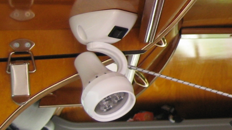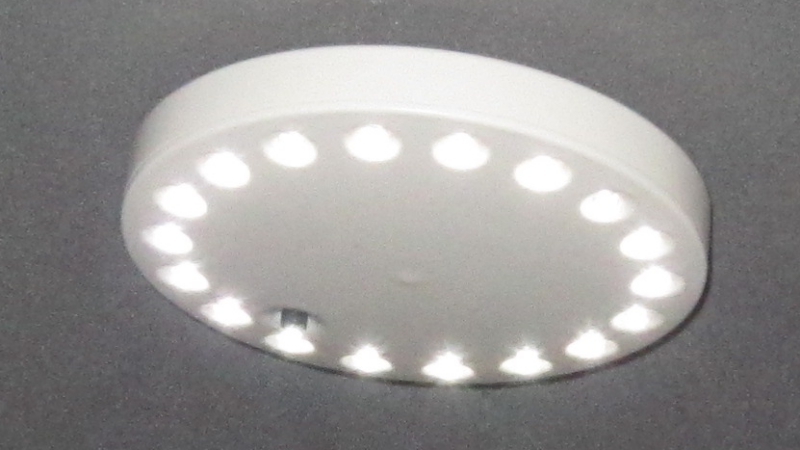 軽キャンピングカーPICCOLO CAMPERに標準搭載されている、19球LEDスポットライトです。スイッチパネルでON/OFF操作します。十分な明るさで、これがあれば夜間の生活も快適に過ごすことができます。
