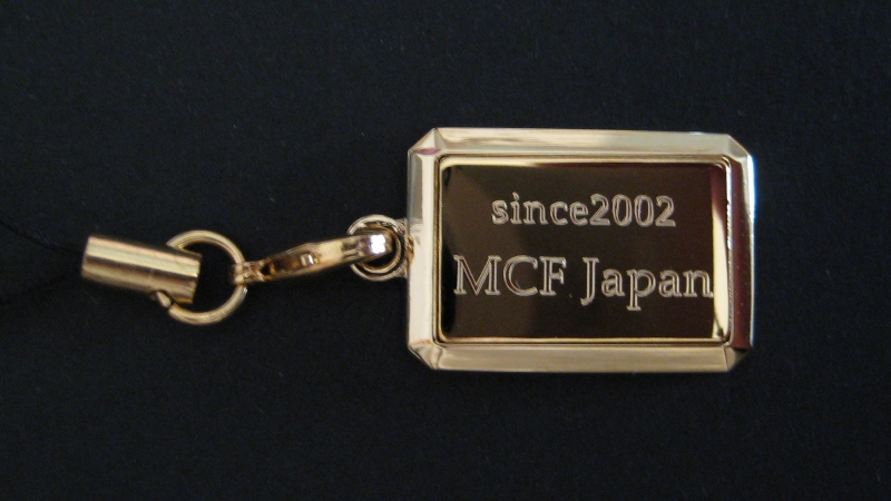 レーザー加工で彫刻を施したゴールドメッキ金属プレート。高級感あふれる携帯ストラップです。