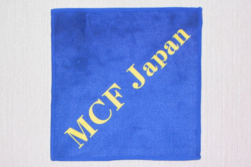 白地のハンドタオルにブルーの背景色と黄色の文字をプリントしました。製造元のフリーワールドさんのご厚意で、無料でサンプル製造していただいたものです。