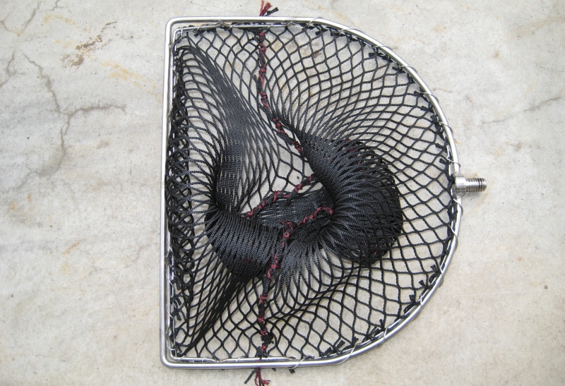 直径6mmのステンレス二重枠で、極太ネットが付属しています。網はほつれないタイプで、網目が大きく、すこぶる使い勝手のよい玉網です。枠全体が二重枠になっていて、内側に網が付いているため、コンクリートを掻き取っても網がダメージを受けにくくなっています。耐久性が抜群で、2009年に購入以来ノーメンテナンスです。壁に付いたタニシはもちろん、水底のタニシも掻き取れる万能タイプです。